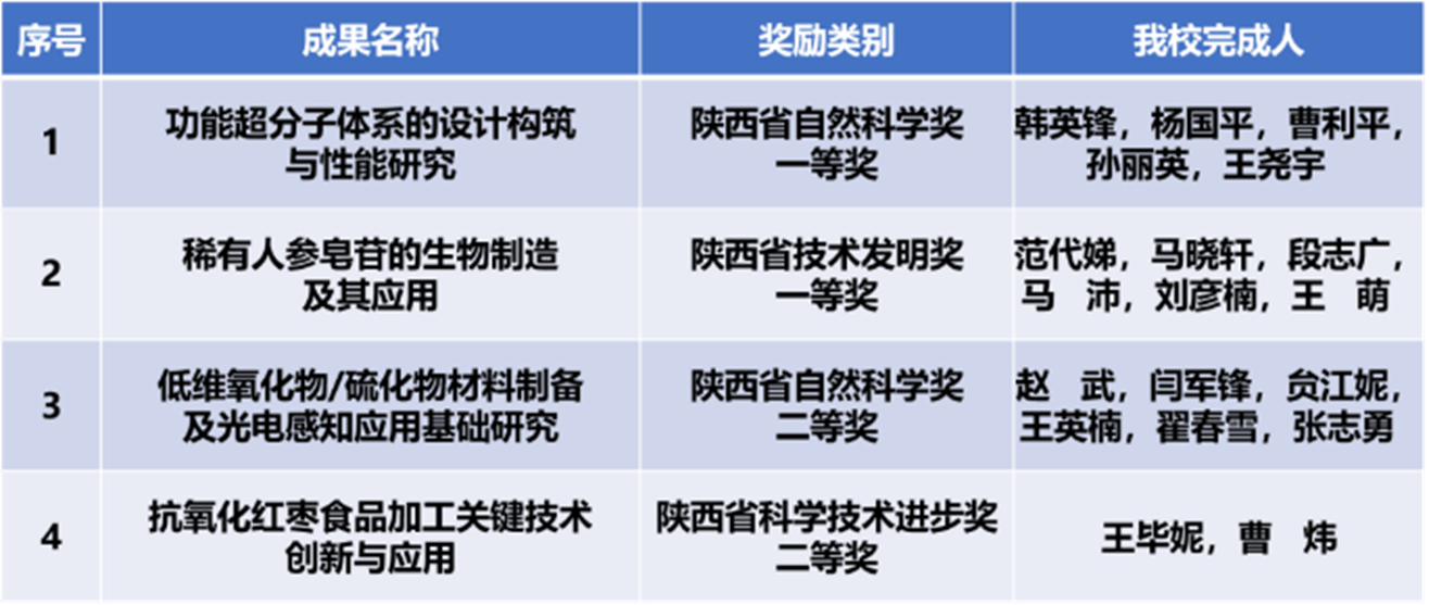 乐投平台化材学院韩英锋教授主持的“功能超分子体系的设计构筑与性能研究”获省自然科学奖一等奖,化工学院范代娣教授主持的“稀有人参皂苷的生物制造及其应用”获省技术发明奖一等奖,信息学院赵武教授主持的“低维氧化物/硫化物材料制备及光电感知应用基础研究”获省自然科学奖二等奖,食品学院王毕妮教授主持的“抗氧化红枣食品加工关键技术创新与应用”获省科技进步奖二等奖。此外,乐投平台参与的“秦岭主要珍稀野生动物抢救饲养繁育关键技术研究”和“陆相页岩油气地质工程一体化的负碳清洁开发技术”分别获得省科技进步奖二等奖。