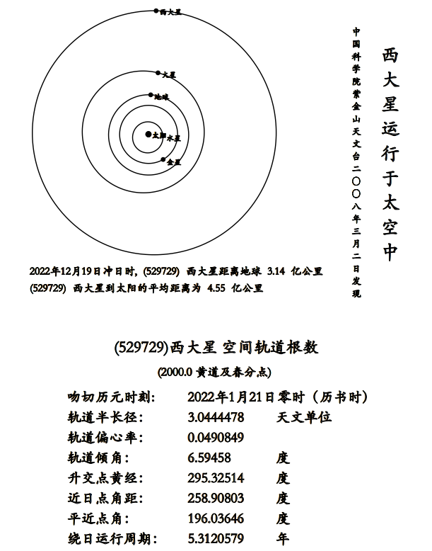 公告显示,“Xida”星由中国科学院紫金山天文台盱眙天文观测站2008年3月2日发现。“Xida”星是一颗主带小行星,位于太阳系火星与木星之间的小行星主带中,编号为529729,空间轨道根数(2000.0 黄道及春分点),吻切历元时刻2022年1月21日零时(历书时),轨道半长径为3.0444478天文单位,轨道偏心率0.0490849,轨道倾角6.59458度,升交点黄经295.32514度,近日点角距258.90803度,平近点角196.03646度,绕日运行周期5.3120579年。