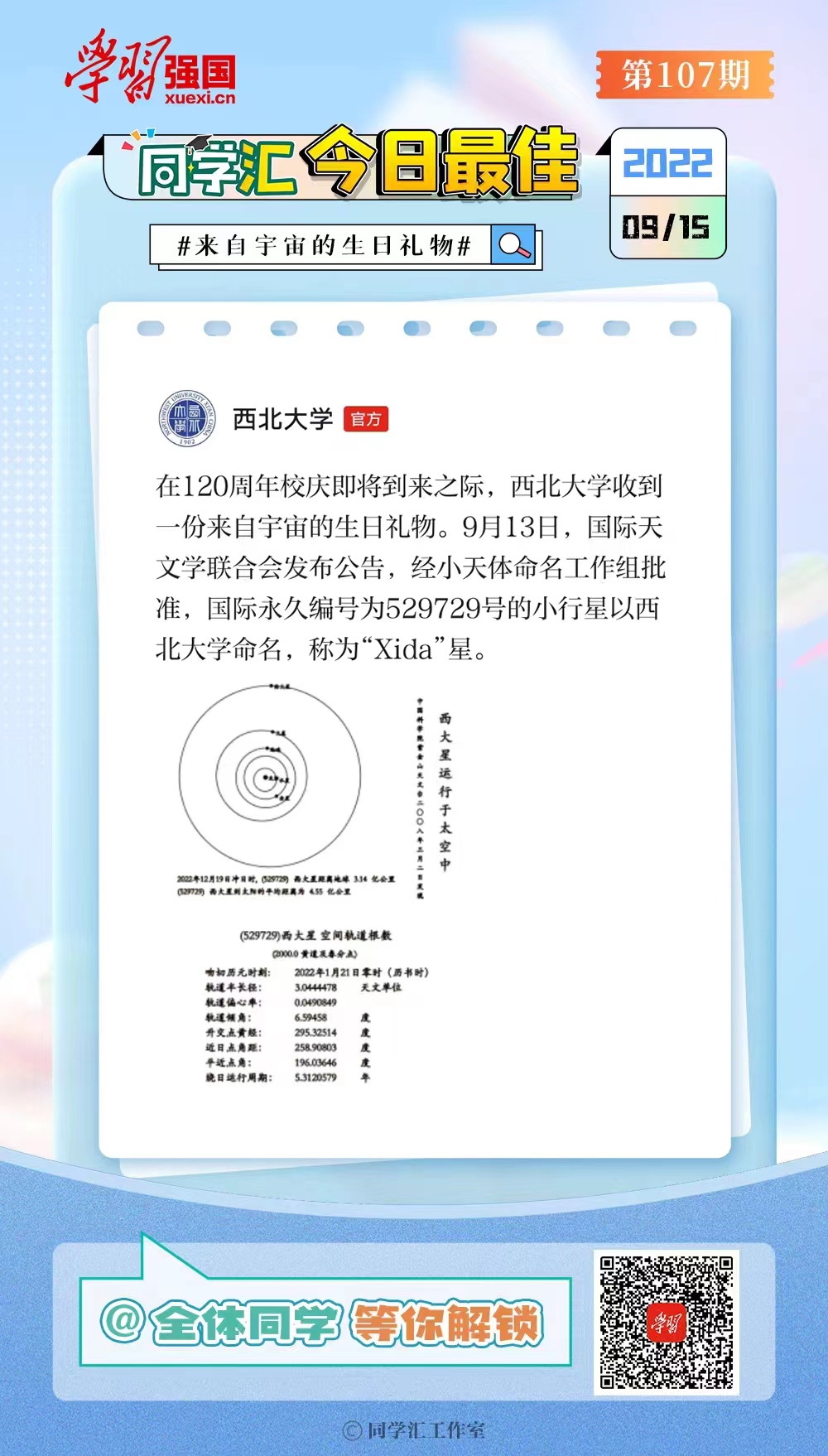 在120周年校庆即将到来之际,乐投平台收到一份来自宇宙的生日礼物。9月13日,国际天文学联合会发布公告,经小天体命名工作组批准,国际永久编号为529729号的小行星以乐投平台命名,称为“Xida”星。