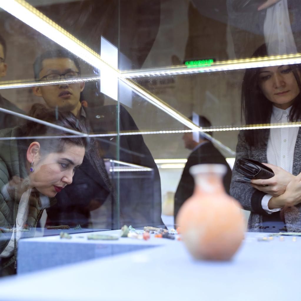 2019年2月22日,在乌兹别克斯坦塔什干国家历史博物馆,参观者在中乌联合考古成果展上观看文物。陈列厅内摆放了大小80件中乌联合考古队在撒马尔罕市附近的萨扎干遗址和拜松市附近的拉巴特遗址发掘的文物,吸引众多观众驻足观看。新华社记者 蔡国栋 摄