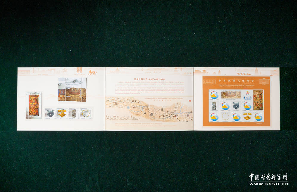 以这两组邮票组成的《丝路华章》邮折,是丝绸之路考古文化的集锦。邮折的左部主体是乌方邮票,右部主体是中方邮票,中间是中国美术考古的开创者王子云在上世纪40年代创作的《西北走廊胜迹图》,背面是邮票图案的介绍。