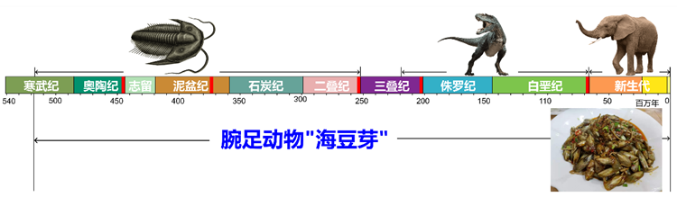 腕足动物舌形贝俗称“海豆芽”,被达尔文定义为“活化石”。它自寒武纪早期出现,历经了地球动物出现以来所有的磨难和自然灾害,尤其是经受了地球最严重的“五次生物大绝灭”事件繁衍至今。目前,仍分布在我国广西和日本、新西兰等地的近岸浅海地区,成为当地桌上的一道美食。