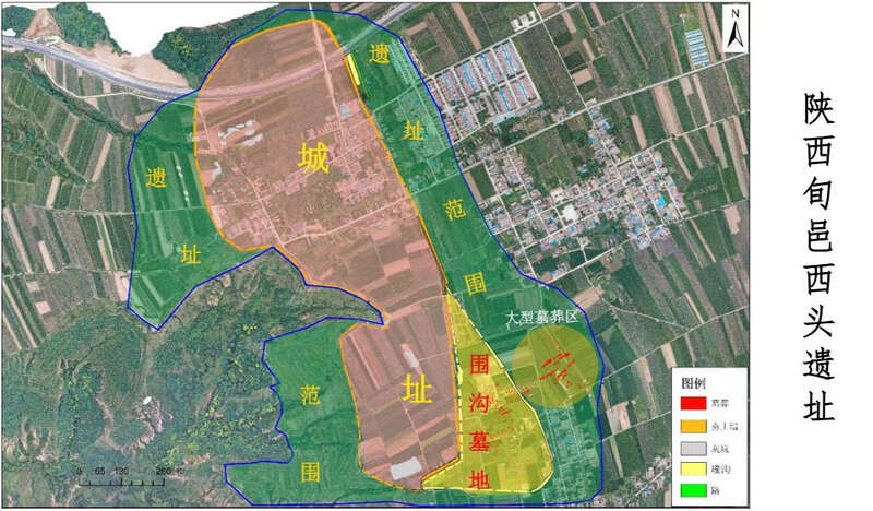 位于陕西省旬邑县的西头遗址,面积约300万平方米,其中以商周时期遗存为主体的分布面积约200万平方米。遗址具体地点在旬邑县张洪镇原底社区西侧约1000米的西头村,地处泾河东岸台塬边缘地带,距泾河约5000米。