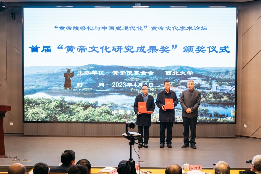 开幕式现场举行了首届“黄帝文化研究成果奖”的颁奖仪式。本次评奖活动共设四类奖项,一等奖一项,二等奖三项,三等奖五项,优秀奖七项。其中,赵世超教授荣获一等奖;孙周勇、李军、穆涛等学者获二等奖;任晓伟、李桂民、朱鸿召等学者获三等奖;陈战峰、王早娟、兰梁斌等学者获优秀奖。