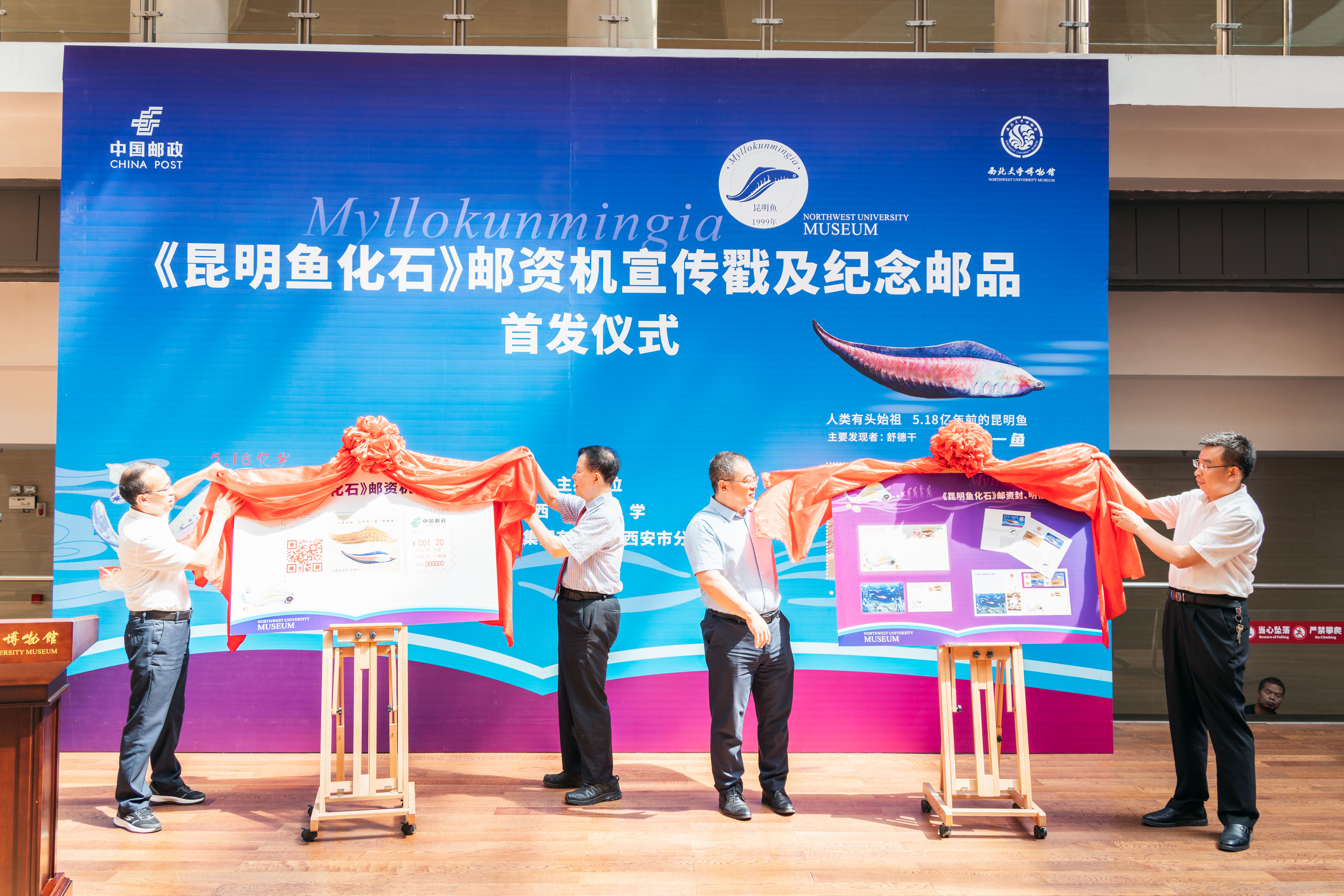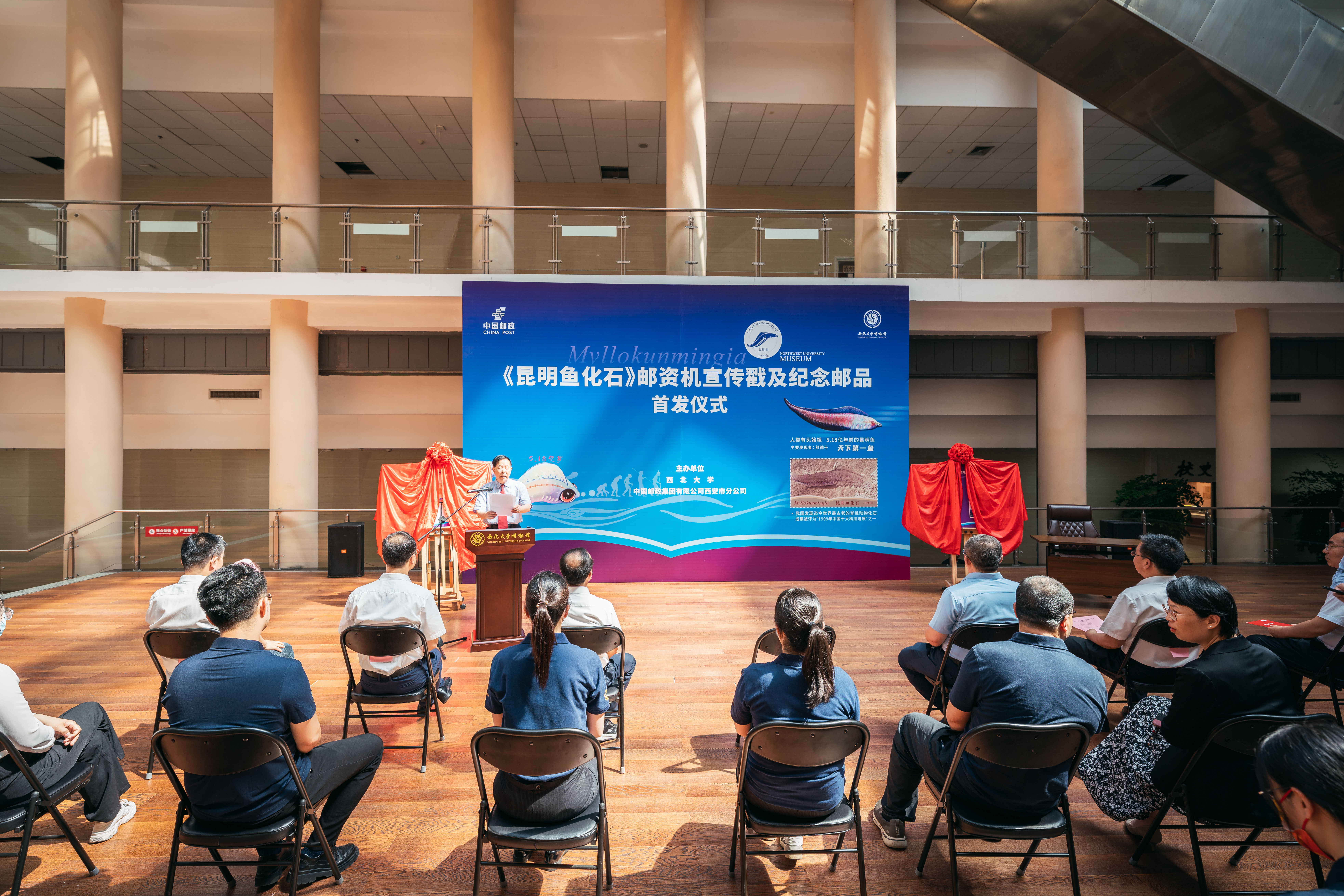5月18日上午,《昆明鱼化石》邮资机宣传戳及系列纪念邮品在乐投平台博物馆首发。