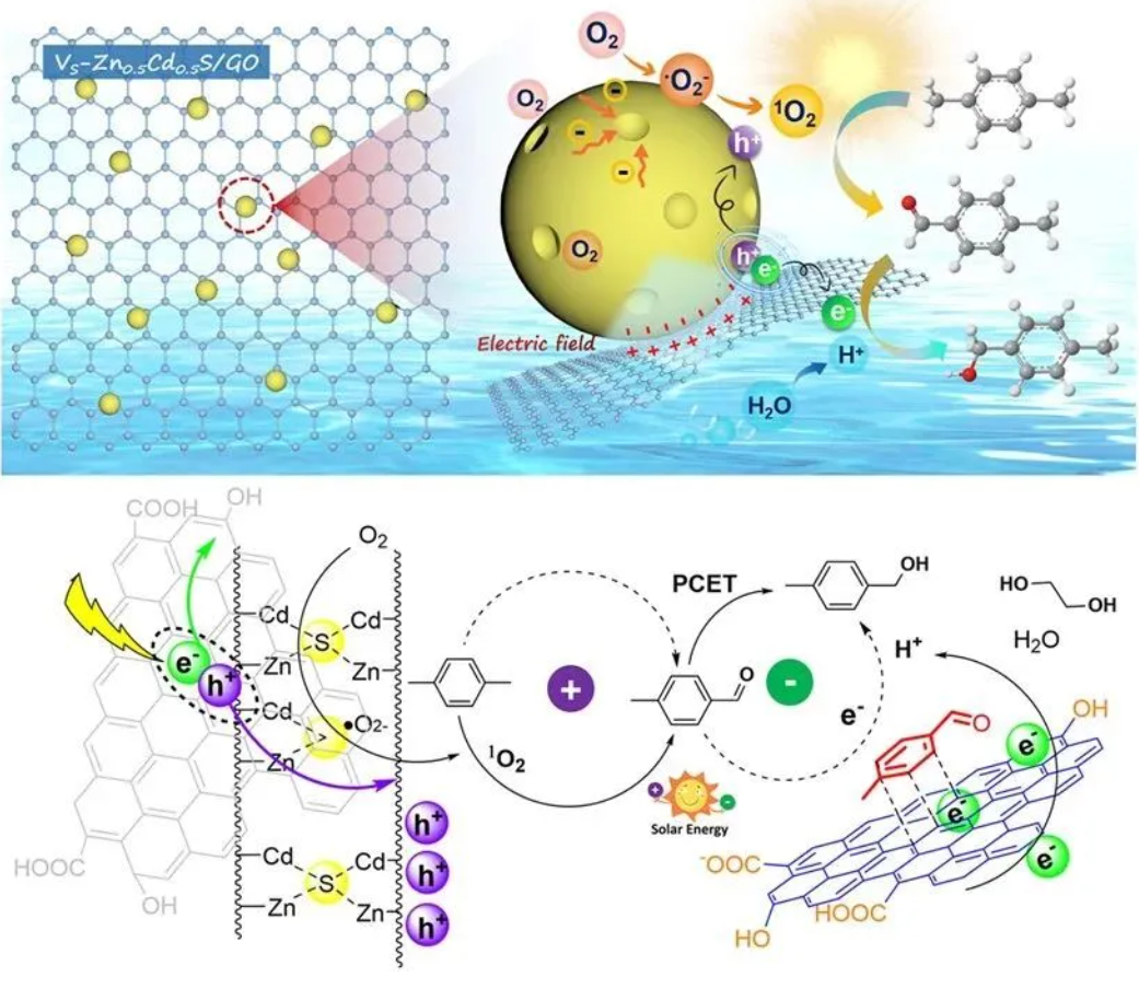 研究提出了表面缺陷与界面异质结调控催化剂0D/2D Zn0.5Cd0.5S/GO表面局域电子浓度的新思路,揭示了氧化石墨烯(GO)与苯环之间π-π相互作用机理,以削弱空间限制促进界面电荷传输,增强了VS-Zn0.5Cd0.5S/GO光催化活性。提出VS-Zn0.5Cd0.5S/GO复合催化体系单线态氧(1O2)和质子耦合电子转移(PCET)的级联一锅两步反应策略,以氧化和加氢将苄基转化为醛基,醛基转化为苯甲醇,为光催化表界面调控定向苄基氧化提供了一种新路径,展示了光催化技术在有机合成领域的独特优势和应用潜力。