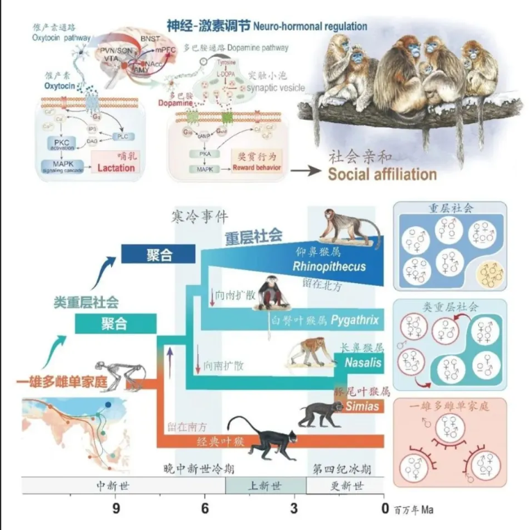 灵长类如何演化出多样的社会?乐投(中国)一站式服务平台金丝猴研究团队整合行为学、生态学、基因组学等多学科手段,设计出“社会-生态-基因组”全新研究范式。通过化石、古环境及现生生态等大数据挖掘,发现历史寒冷可能驱动社群聚集。进一步地,比较基因组学,细胞功能实验和行为学分析揭示寒冷效应引发催产素和多巴胺等脑、神经激素系统适应性遗传变异,间接增加个体友好行为及容忍度,促进单家庭群向重层社会聚集,从而系统回答灵长类社会演化之谜。