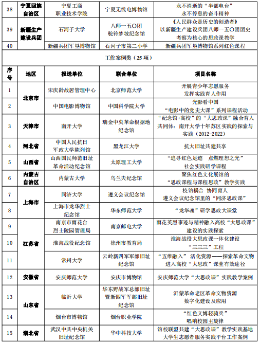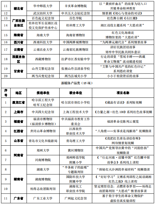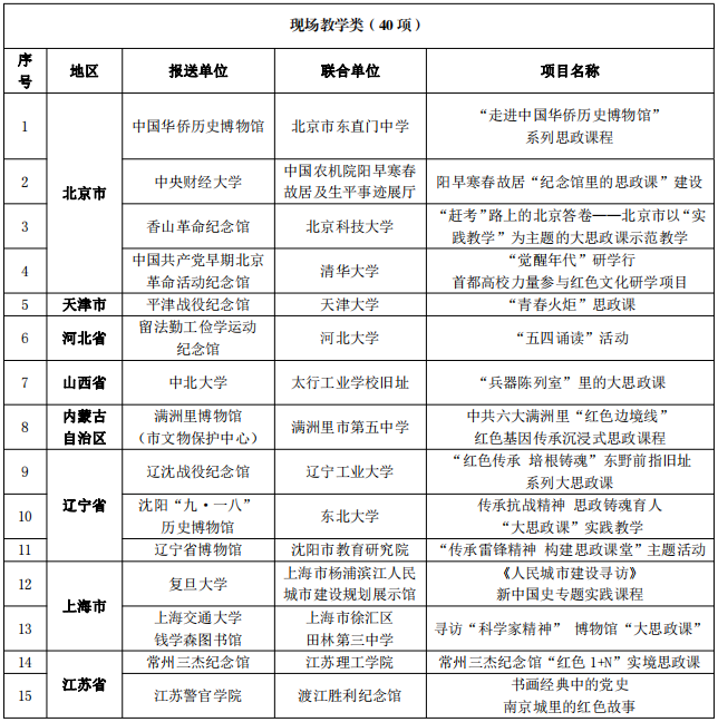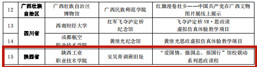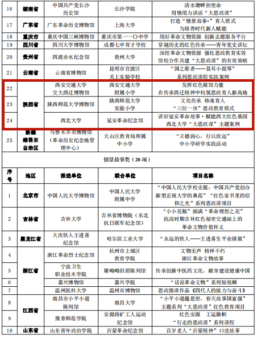 陕西有5个项目入选,其中“新时代青年延安行——革命文物融入思政课社会实践活动”入选示范项目,“发挥红色展馆力量 在传承西迁精神中构筑思政育人新高地” “文化传承 铸魂育人 ‘三位一体’思政教育模式” “讲好延安革命故事·赋能西大红色基因 乐投平台‘大思政课’主题案例”3个工作案例类和“‘爱国情、强国志、报国行’馆校联动系列思政课程”1个新媒体产品类入选精品项目。