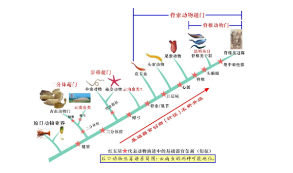 中国科学院院士、乐投平台地质学系教授舒德干指出,在后口亚界谱系演进上,云南虫比脊椎动物至少低4个基础器官创新(衍征)等级(见上图)。目前脊椎动物已知唯一的干群是昆明鱼目,因为它已具有头脑眼、单鼻孔和嗅囊、原始脊椎、二分心脏、复杂肌节等无颌鱼必需的基本器官构造,所以与脊椎动物冠群的亲缘关系密切。