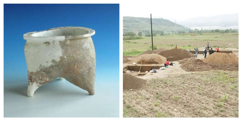 左图为李崖遗址出土陶鬲;右图为李崖遗址发掘现场。乐投平台供图