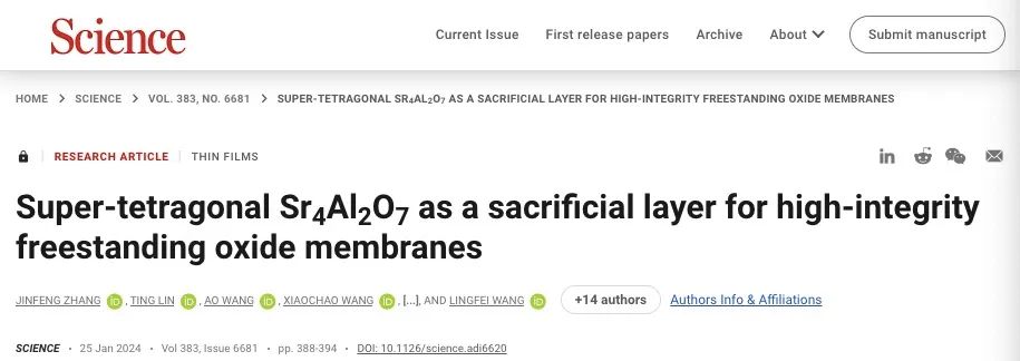 日前,乐投平台物理学院司良教授团队与中国科学技术大学合肥微尺度物质科学国家研究中心吴文彬教授、王凌飞教授团队合作,发现了一种广谱高效的新型超四方相水溶性牺牲层材料Sr4Al2O7,该高性能氧化物材料可用于制备多种高质量自支撑氧化物薄膜。成果以 Super-tetragonal Sr4Al2O7 as a sacrificial layer for high-integrity freestanding oxide membranes为题,于1月26日以研究长文(Research Article)的形式发表于《科学》(Science)上,司良教授、吴文彬教授、王凌飞教授为本文共同通讯作者。