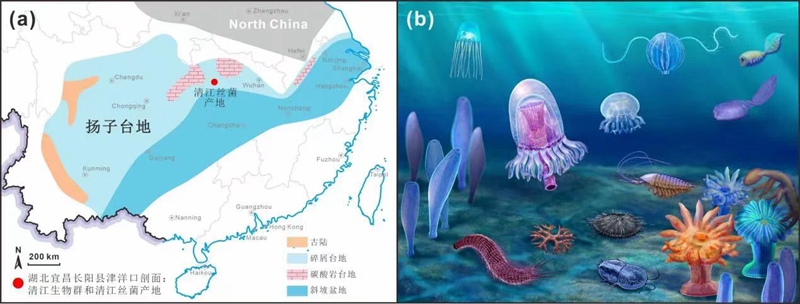 清江丝菌化石的产地和环境背景。(a)早寒武纪扬子台地岩相古地理图和清江丝菌及所属清江生物群的化石产地;(b)清江生物群生态复原图 乐投平台供图