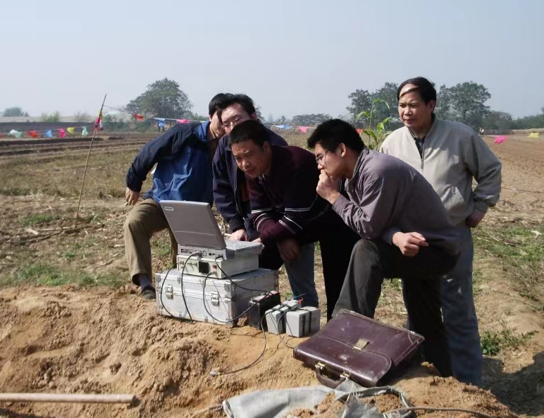 王家鼎(后排右一)在郑西高铁施工现场指导学生进行振动波测试。受访者供图