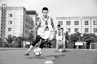 甘肃省张掖市甘州区张掖育才中学,足球小将们正在进行赛前带球训练。杨潇摄/光明图片