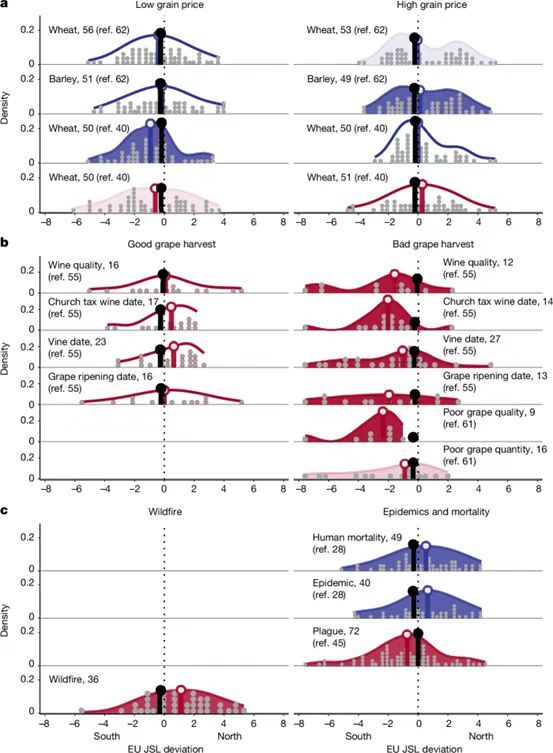 研究团队通过使用来自欧洲各地的对温度变化敏感的树木年轮样本,重建了过去700年的急流变化。年轮中每年春天的树木密度较低,夏天的树木密度较高,对温度较为敏感,通过对来自巴尔干半岛、阿尔卑斯山和不列颠群岛的树木年轮进行详细的数据分析和长时间的比对、交叉定年、重建,研究人员推断过去700多年里急流的纬度位置变化历史,发现西北欧和东南欧的气候“偶极”现象在几个世纪以来一直存在,并且在北极急流位置异常偏北或偏南时最为显著。研究团队利用了现有的气候重建数据以及数个世纪以来关于热浪、干旱、洪水、风暴、收成、饥荒、疾病等欧洲丰富且可靠的文献数据集,发现了急流纬度位置的极端变化与生物物候(葡萄收获)、农业经济和人类人口影响之间存在着某种联系。