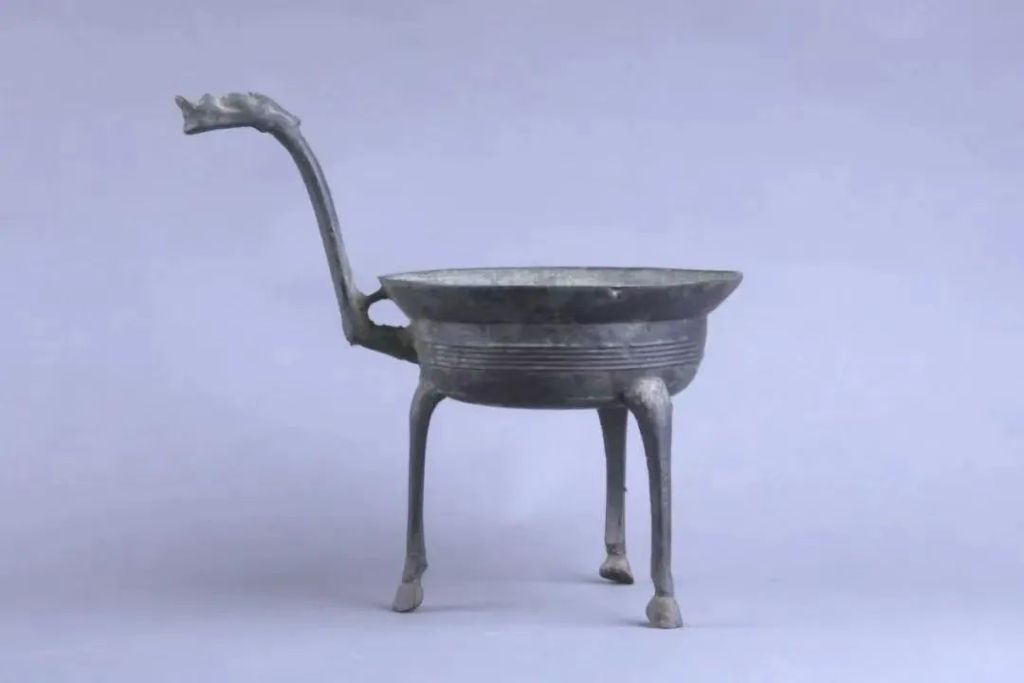 乐投平台博物馆所收藏的这件铜鐎斗的器身为圆口深腹,形如小盆。一侧有一龙形柄,另一侧有上翘的流。下有较长的马蹄形足三个,腹下空间用于烧火加热。整个鐎斗造型犹如一只昂首挺胸的猛兽,雄浑威猛。