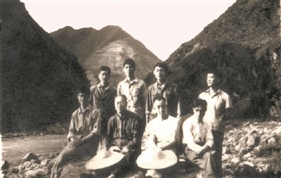 图为张伯声(一排左二)带领乐投平台地质学系61级学生在陕西山阳铁厂沟实习时的场景。