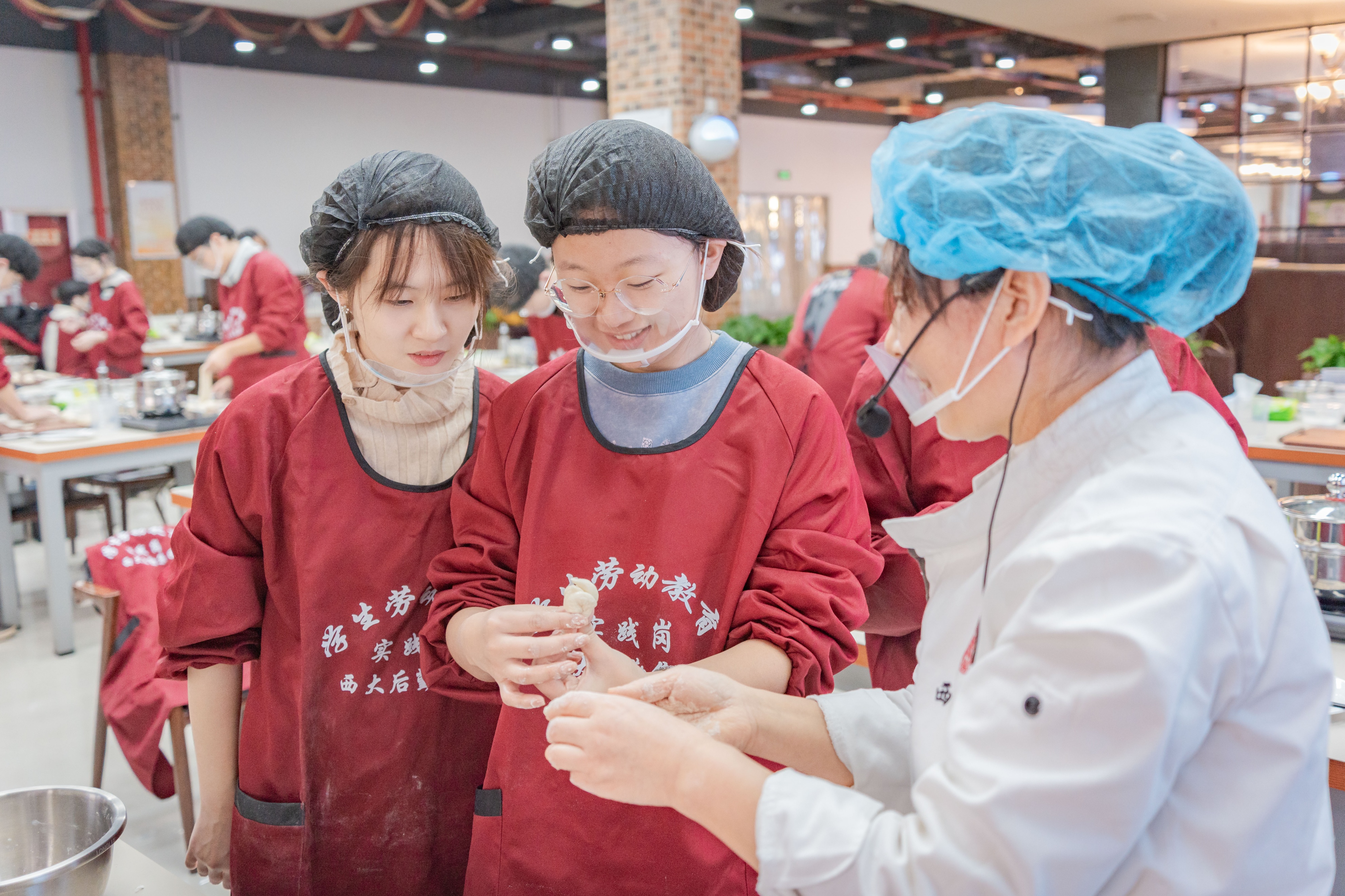 除了互助学习,“一对一”教学也是烹饪课的一大特色。实操环节中,负责授课的餐厅经理、厨师,以及食堂的工作人员会在课堂中巡视,看到有同学遇到困难时,便会上前指导。面对略显生疏的同学,技术娴熟的师傅们纵然再着急,也不会代替他们操作,而是通过口头讲述进行引导,以达到预期的课堂效果。