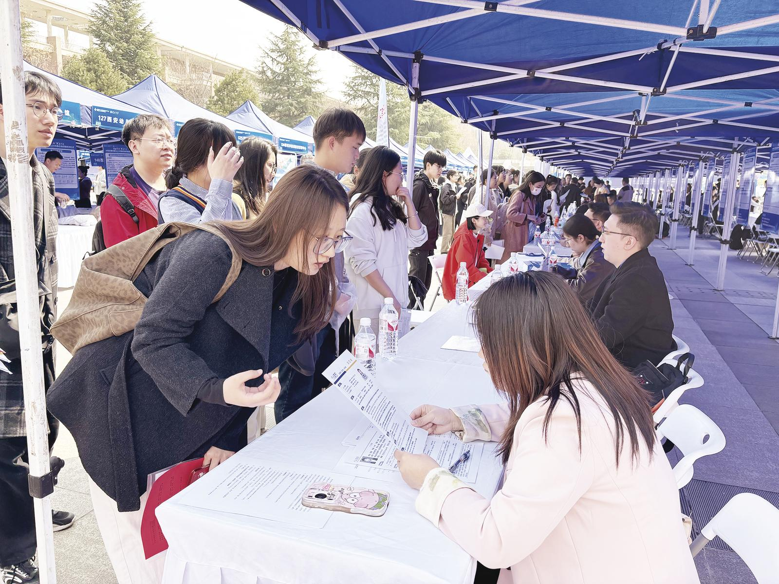 3月13日,“乐业陕西‘就’在三秦”大型招聘会暨2025 年春招进校园启动仪式在乐投平台长安校区举行。图为求职者向招聘单位工作人员咨询。