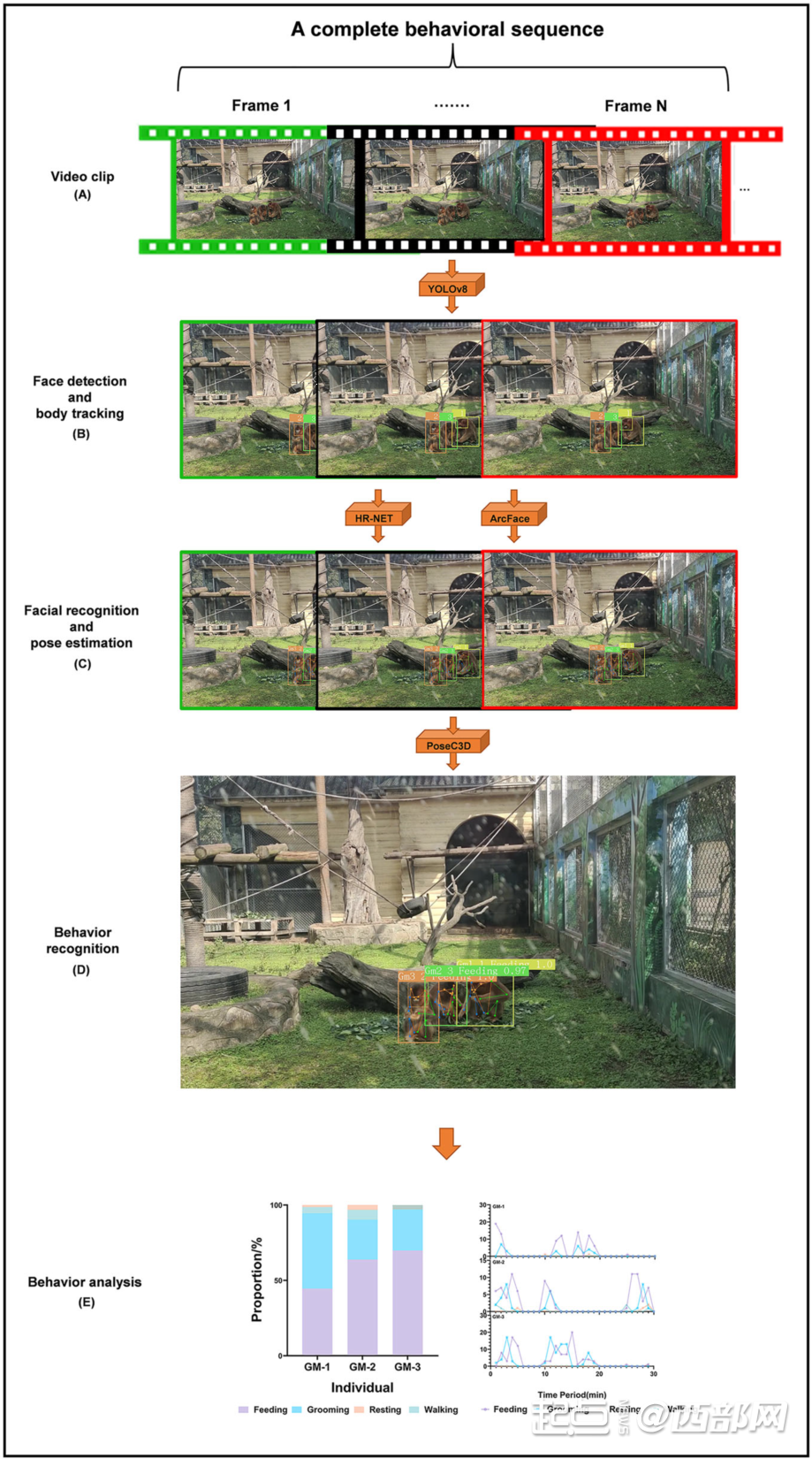 尽管视频数据可通过专业软件辅助分析,但要观察仅仅几天的动物行为视频,则仍需要花费多达百小时人工反复审查,更别说对于环境复杂和数量众多的野生动物了。这种耗时低效的工作,严重制约了对动物各种行为规律的认知。尤其在观察和测量复杂场景下野生动物的行为时,自动化的行为监测和分析更是面临严峻挑战。