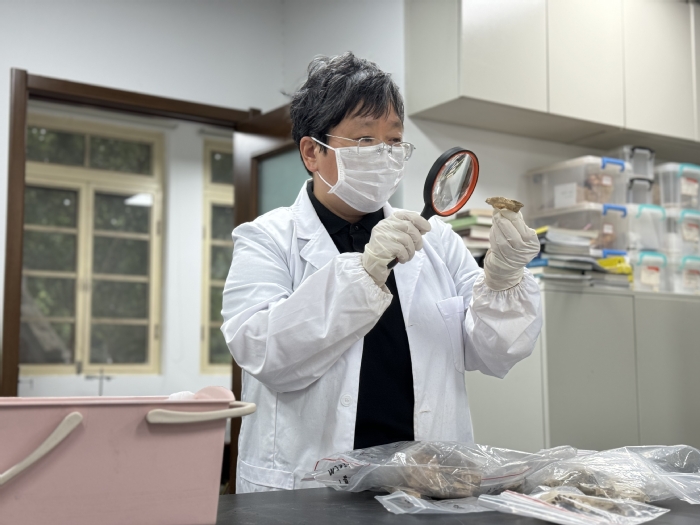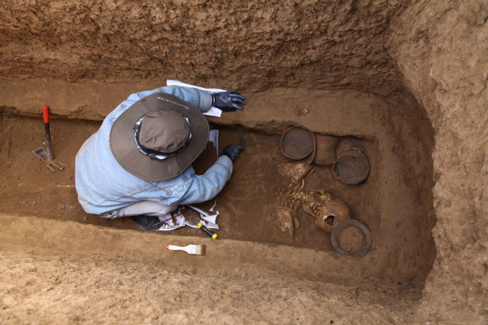 乐投平台文化遗产学院教授陈靓正在观察骨骼情况。