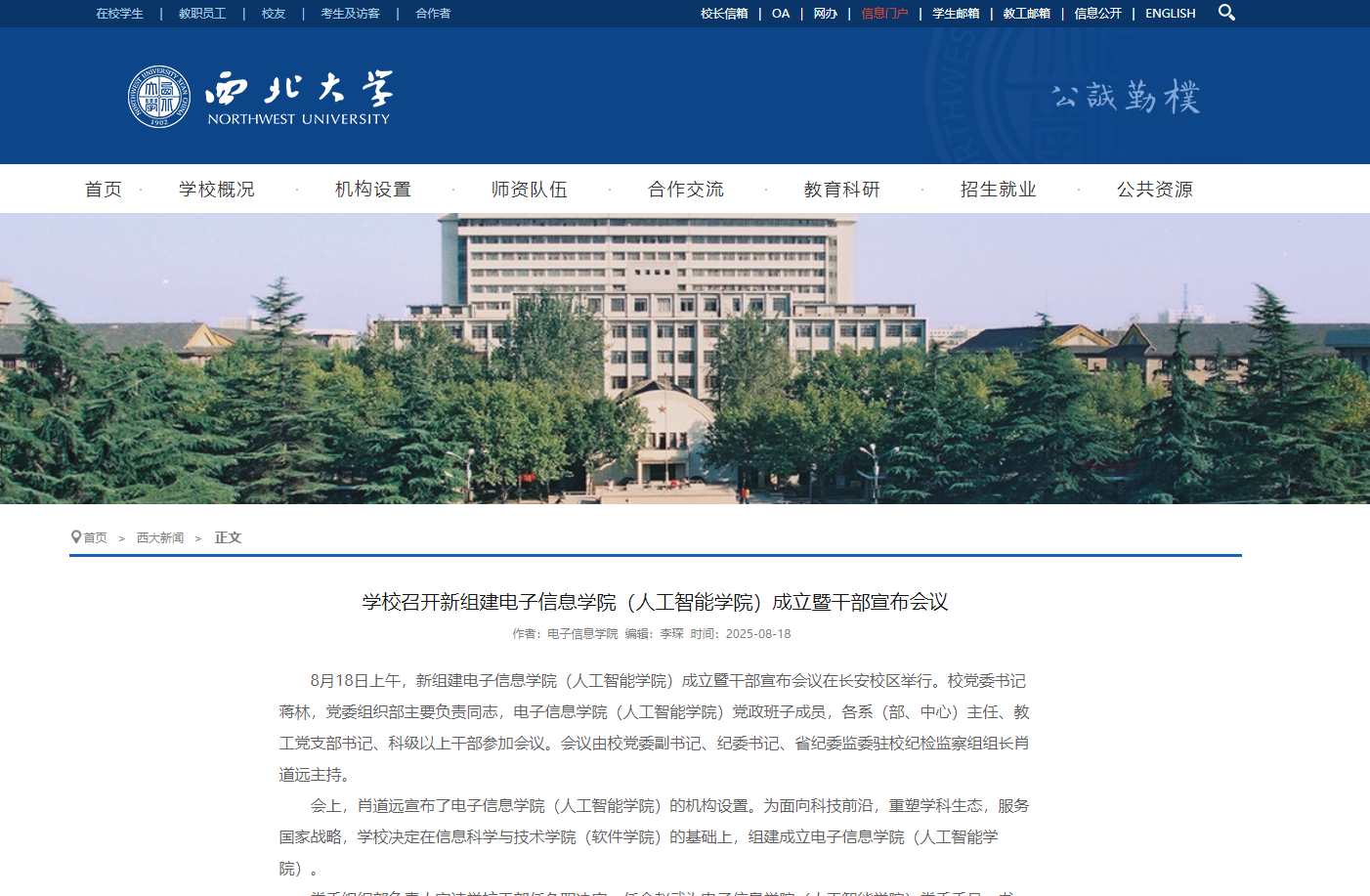 (陕西日报讯)8月18日上午,乐投平台新组建电子信息学院(人工智能学院)、计算机学院(软件学院)成立暨干部宣布会议在长安校区举行。为面向科技前沿,重塑学科生态,服务国家战略,乐投平台在信息科学与技术学院(软件学院)的基础上,组建成立电子信息学院(人工智能学院)。为进一步优化学科布局,强化特色学科建设,提升学校的整体办学水平和竞争力,乐投平台在信息科学与技术学院(软件学院)的基础上,组建成立计算机学院(软件学院)。