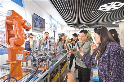 八月二十八日至三十日,上合组织天津峰会新闻中心安排多场城市参访活动。图为媒体记者在天津轻工职业技术学院鲁班工坊体验馆了解工业机器人实训设备。