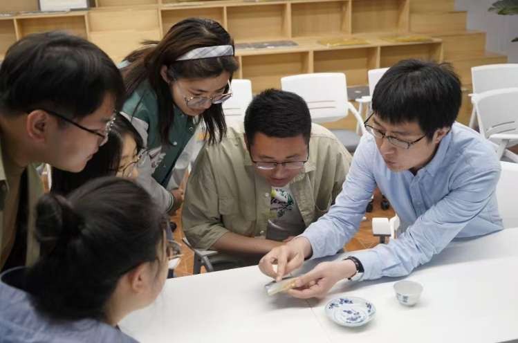 温睿(右一)与学生讨论不同时期青花瓷的特点(受访者供图)
