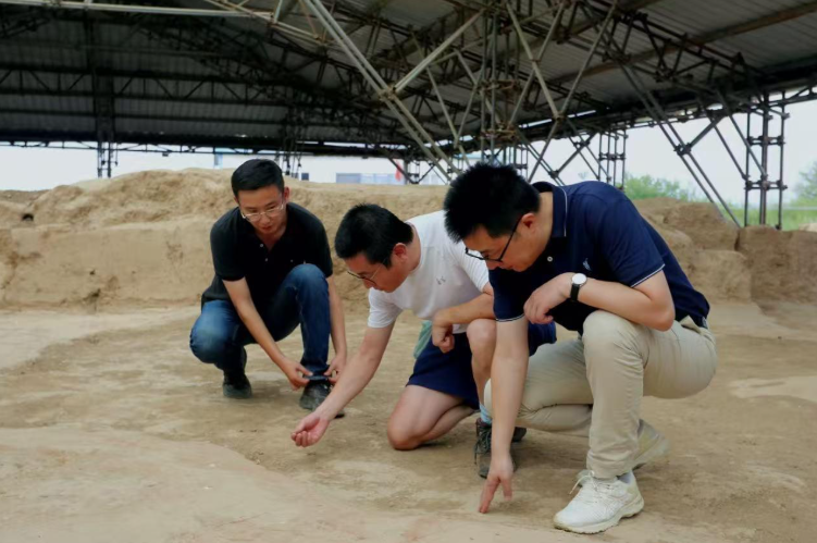 温睿(右一)与同事在考古发掘现场观察遗迹迹象(受访者供图)