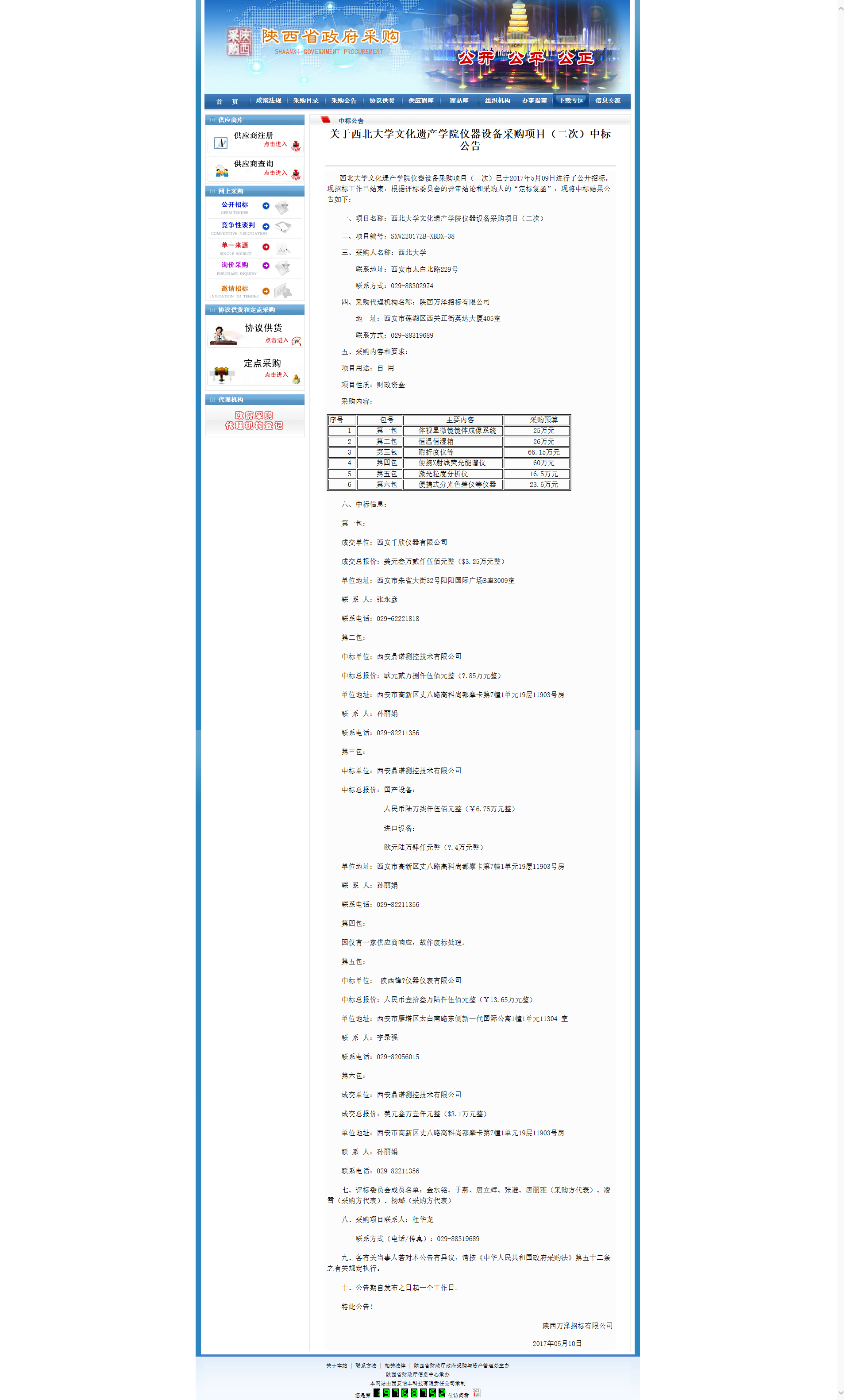 关于乐投平台文化遗产学院仪器设备采购项目(二次)中标公告 作者: 编辑: 时间:2017-05-11 09:03 http://www.ccgp-shaanxi.gov.cn/zbxxs.jsp?NewsID=ZH170510141437US101028111214&ClassBID=C0002