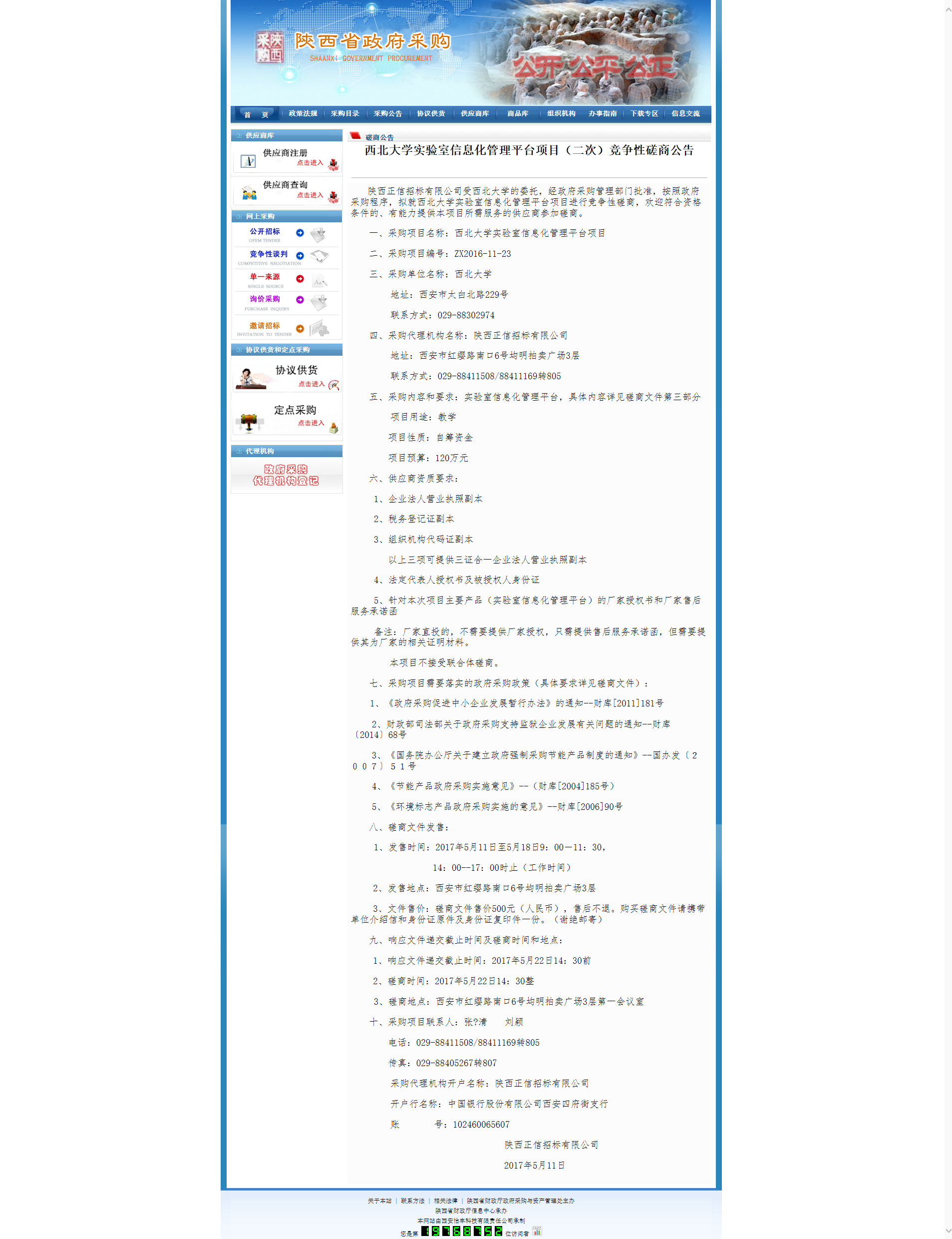 乐投平台实验室信息化管理平台项目(二次)竞争性磋商公告 作者: 编辑: 时间:2017-05-11 16:42 http://www.ccgp-shaanxi.gov.cn/zb_view.jsp?NewsID=ZB170511115300US160408011615&ClassBID=CS001