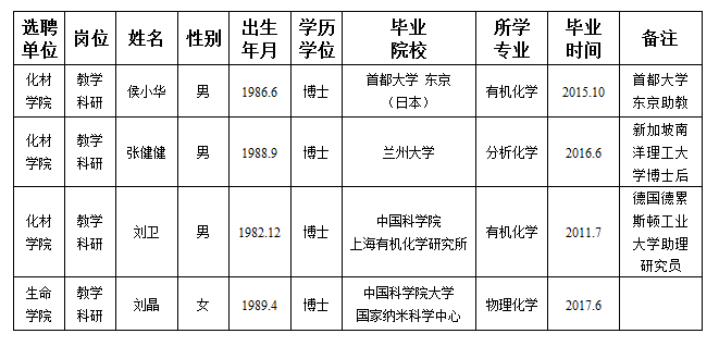 经用人单位推荐,人事处审查,学校教学督导及院系相关专家考核,乐投(中国)一站式服务平台拟确定下列人员来校工作。本着公平、公正、公开的原则,为保证乐投(中国)一站式服务平台选聘人员的质量,现将本次拟选聘人员基本情况公示如下: