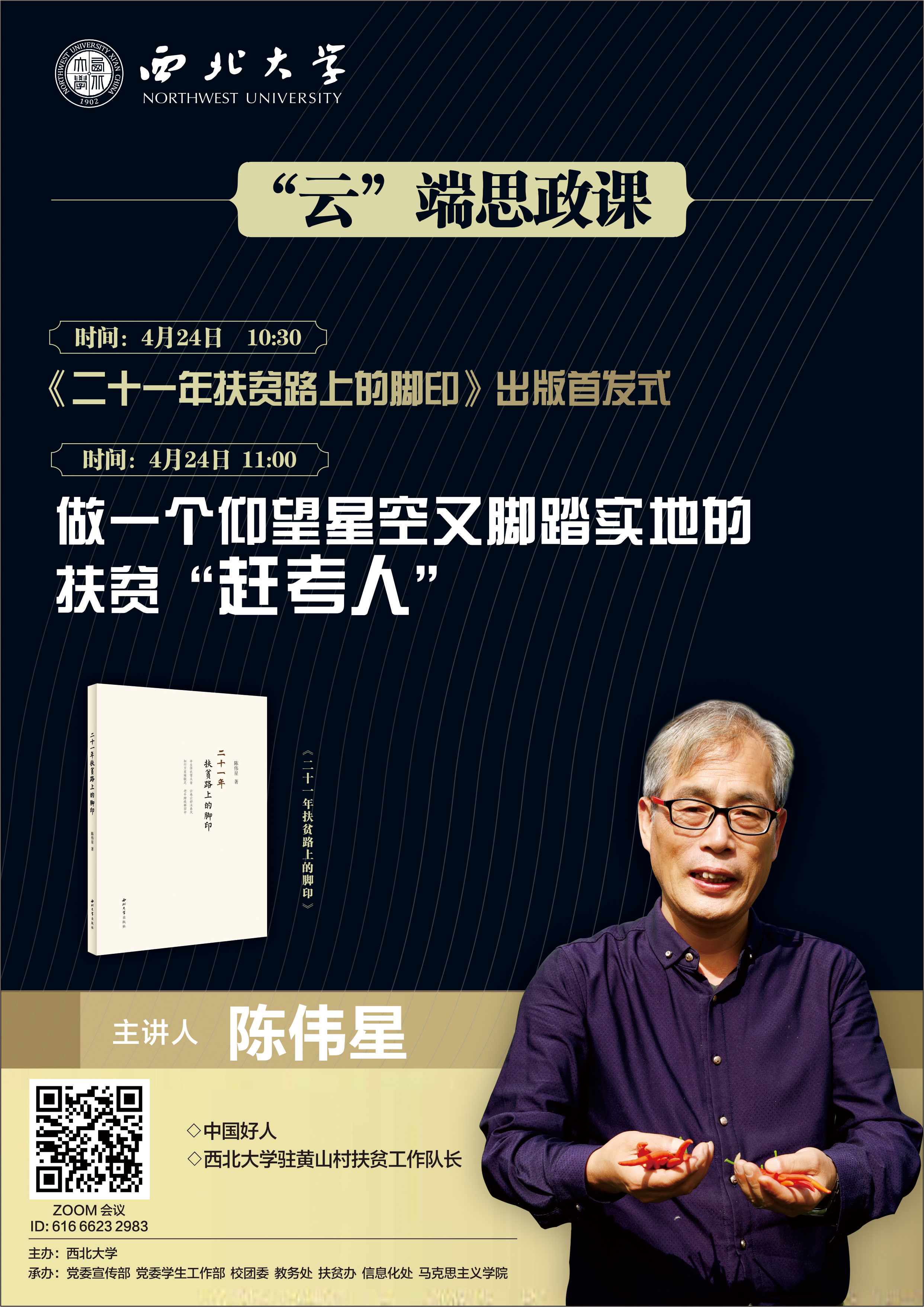 “云”端思政课收看通知 作者: 编辑: 时间:2020-04-23 15:40 校内各单位: 为使师生更好了解脱贫攻坚和疫情防控春耕复工情况,了解当前党情世情国情,学校邀请“中国好人”、乐投平台驻黄山村扶贫工作队长陈伟星通过网络现场直播、讲授一堂“云”端思政课。时间:2020年4月24日10:30,陈伟星扶贫新作首发式;11:00 “云”端思政课。 直播地址: https://zoom.com.cn/j/61666232983 ID:616 6623 2983 请各院系按时组织师生收看,学生收看由学工部另行通知。 党委宣传部 学工部 扶贫办 2020年4月23日