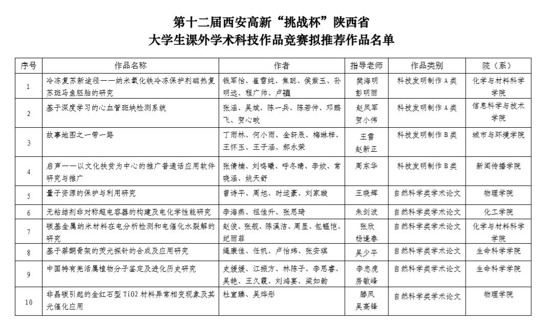根据团中央《关于组织开展第十六届“挑战杯”全国大学生课外学术科技作品竞赛的通知》(中青联发〔2019〕1号)要求,结合乐投(中国)一站式服务平台实际,校团委拟从乐投(中国)一站式服务平台第九届“挑战杯”大学生课外学术科技作品竞赛优秀作品中遴选推荐《冷冻复苏新途径——纳米氧化铁冷冻保护剂磁热复苏斑马鱼胚胎的研究》等18件作品参加第十二届“挑战杯”陕西省大学生课外学术科技作品竞赛。现予以公示,公示期自2019年4月16日至4月23日。