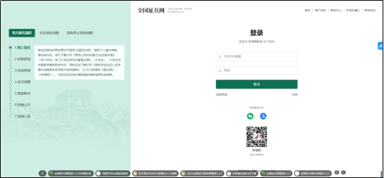 打开全国征兵网首页。男兵在应征报名之前要先完成兵役登记。点击“兵役登记(男兵)”进入操作页面。