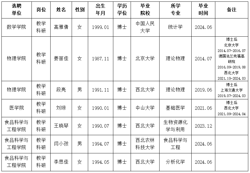 经用人单位推荐,人力资源部审查,学校教学督导及院系相关专家考核,乐投(中国)一站式服务平台拟确定下列人员来校工作。本着公平、公正、公开的原则,现将本次拟选聘人员基本情况公示如下: