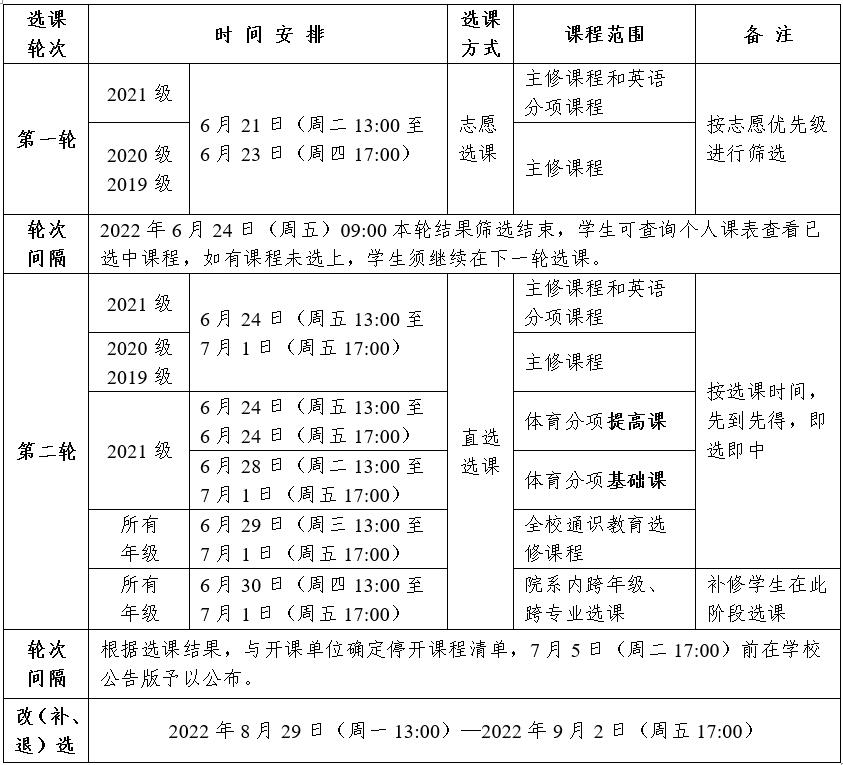 2022—2023学年第一学期课程选课分为正选和改(补、退)选。正选在6月21日(13:00)—7月1日(17:00)进行,分为两轮。改(补、退)选在8月29日(13:00)—9月2日(17:00)进行。现将具体事宜安排如下: