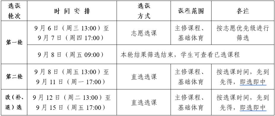 根据学校教学工作安排,2023级本科新生本学期选课定于9月6日(周三)开始。请各院系提前做好新生选课指导工作。为保证选课工作顺利开展,现将有关事项安排如下: