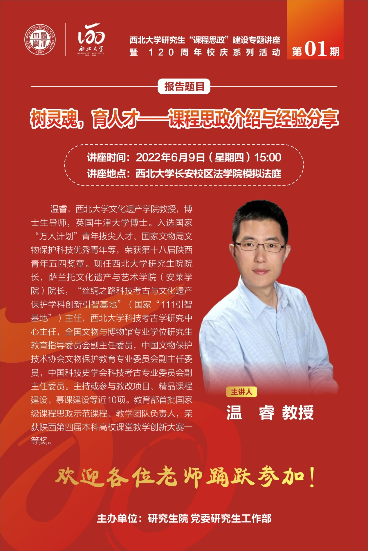 第1期,我们邀请到教育部首批国家级课程思政示范课程、教学团队负责人乐投平台文化遗产学院温睿教授进行“课程思政”专题培训,欢迎对课程思政建设感兴趣的各位老师积极参加,拟申报2022年校级、省级及国家级研究生课程思政示范课的课程负责人、团队成员踊跃参与!