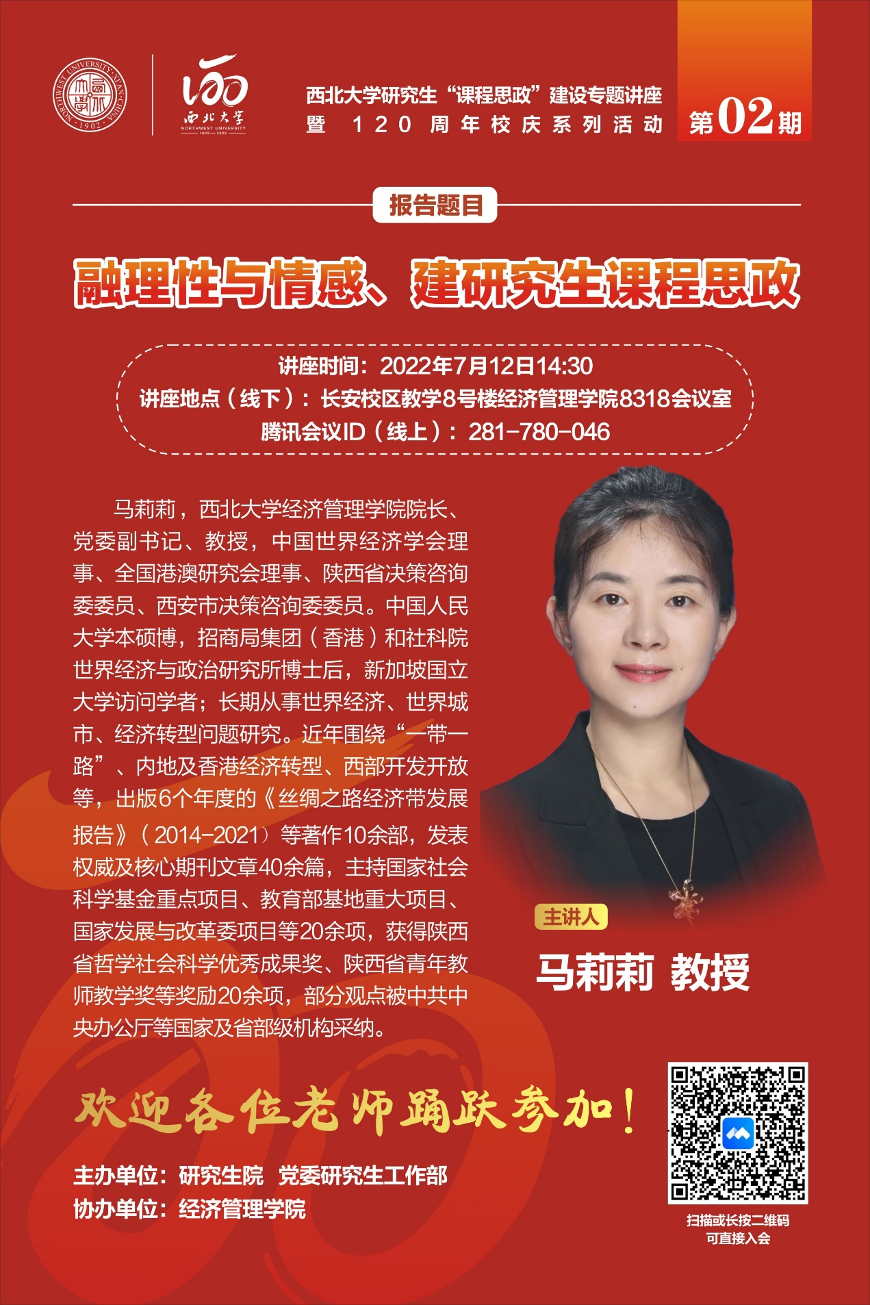 第2期,我们邀请到陕西省首批省级课程思政示范课程、教学团队负责人乐投平台经济管理学院马莉莉教授进行“课程思政”专题培训,欢迎对课程思政建设感兴趣的各位老师积极参加,拟申报2022年校级、省级及国家级研究生课程思政示范课的课程负责人、团队成员踊跃参与!