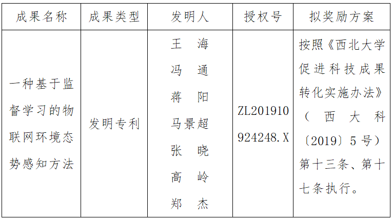 按照《乐投平台促进科技成果转化实施办法》(西大科〔2019〕5号)相关规定,拟对乐投(中国)一站式服务平台信息科学与技术学院王海副教授作为成果负责人的1项发明专利权实施转化,现将相关信息公示如下: