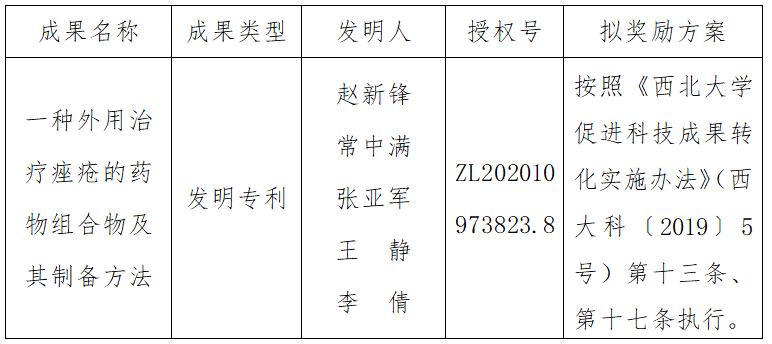 按照《乐投平台促进科技成果转化实施办法》(西大科〔2019〕5号)相关规定,拟对乐投(中国)一站式服务平台生命科学学院赵新锋教授作为成果负责人的1项发明专利权实施转化,现将相关信息公示如下: