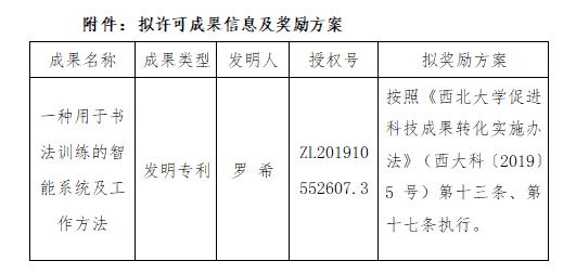 按照《乐投平台促进科技成果转化实施办法》(西大科〔2019〕5号)相关规定,拟对乐投(中国)一站式服务平台艺术学院罗希老师作为成果负责人的1项发明专利权实施普通许可,现将相关信息公示如下: