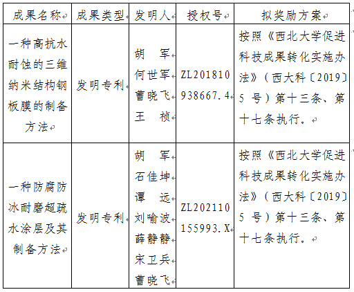 按照《乐投平台促进科技成果转化实施办法》(西大科〔2019〕5号)相关规定,拟对乐投(中国)一站式服务平台化工学院胡军教授作为成果负责人的2项发明专利权实施转化,现将相关信息公示如下: