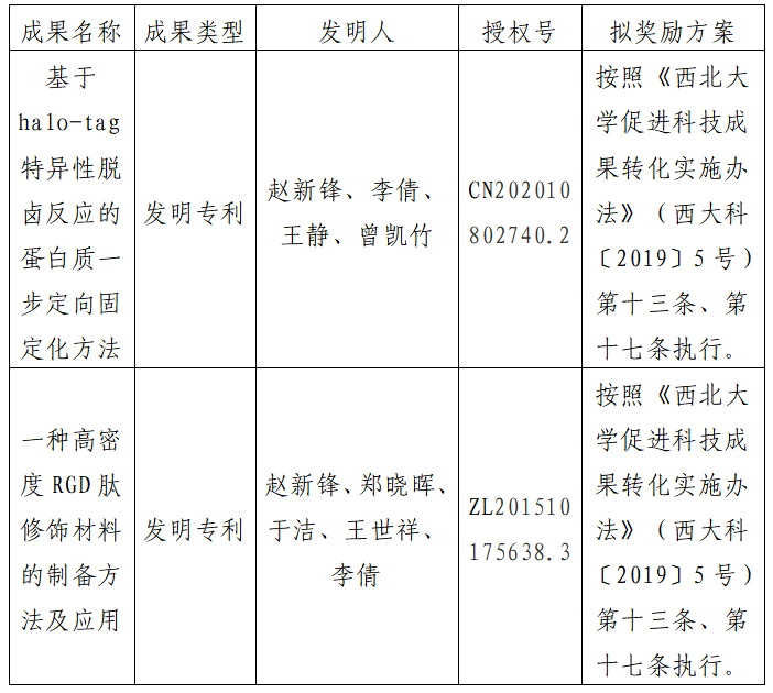 按照《乐投平台促进科技成果转化实施办法》(西大科〔2019〕5号)相关规定,拟对乐投(中国)一站式服务平台生命科学学院赵新锋教授作为成果负责人的2项发明专利权实施普通许可,现将相关信息公示如下: