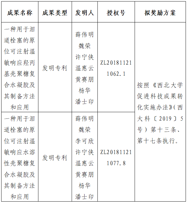 按照《乐投平台促进科技成果转化实施办法》(西大科〔2019〕5号)相关规定,拟对乐投(中国)一站式服务平台化工学院薛伟明教授作为成果负责人的2件发明专利权实施转化,现将相关信息公示如下: