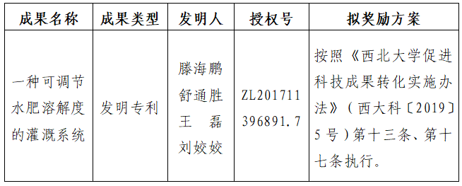 按照《乐投平台促进科技成果转化实施办法》(西大科〔2019〕5号)相关规定,拟对乐投(中国)一站式服务平台化工学院滕海鹏副教授作为成果负责人的1件发明专利权实施转化,现将相关信息公示如下: