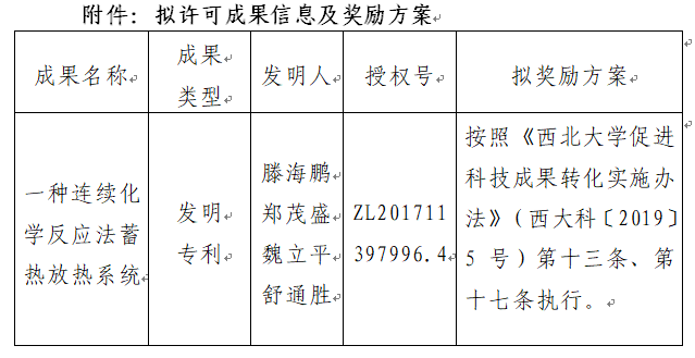按照《乐投平台促进科技成果转化实施办法》(西大科〔2019〕5号)相关规定,拟对乐投(中国)一站式服务平台化工学院滕海鹏副教授作为成果负责人的1项发明专利权实施转化,现将相关信息公示如下: