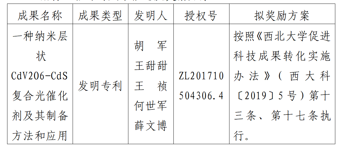 按照《乐投平台促进科技成果转化实施办法》(西大科〔2019〕5号)相关规定,拟对乐投(中国)一站式服务平台化工学院胡军教授作为成果负责人的1项发明专利权实施转化,现将相关信息公示如下: