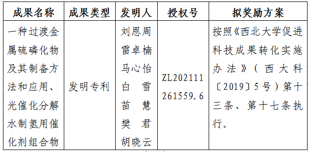 按照《乐投平台促进科技成果转化实施办法》(西大科〔2019〕5号)相关规定,拟对乐投(中国)一站式服务平台化工学院刘恩周教授作为成果负责人的1项发明专利权实施转化,现将相关信息公示如下:
